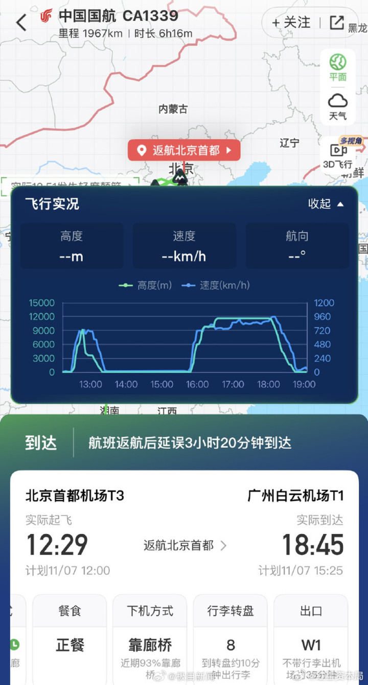 发布日期:2025-11-19 08:18 点击次数:18911月7日,有网友发文称,当日由北京飞往广州的CA1339航班起飞后返航至北京首都机场,两个多小时后再次起飞。