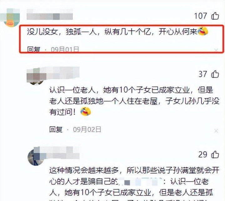 有网友留言说:“身边没有孩子,自己一个人,就算有再多的钱,能带来多少快乐呢?”